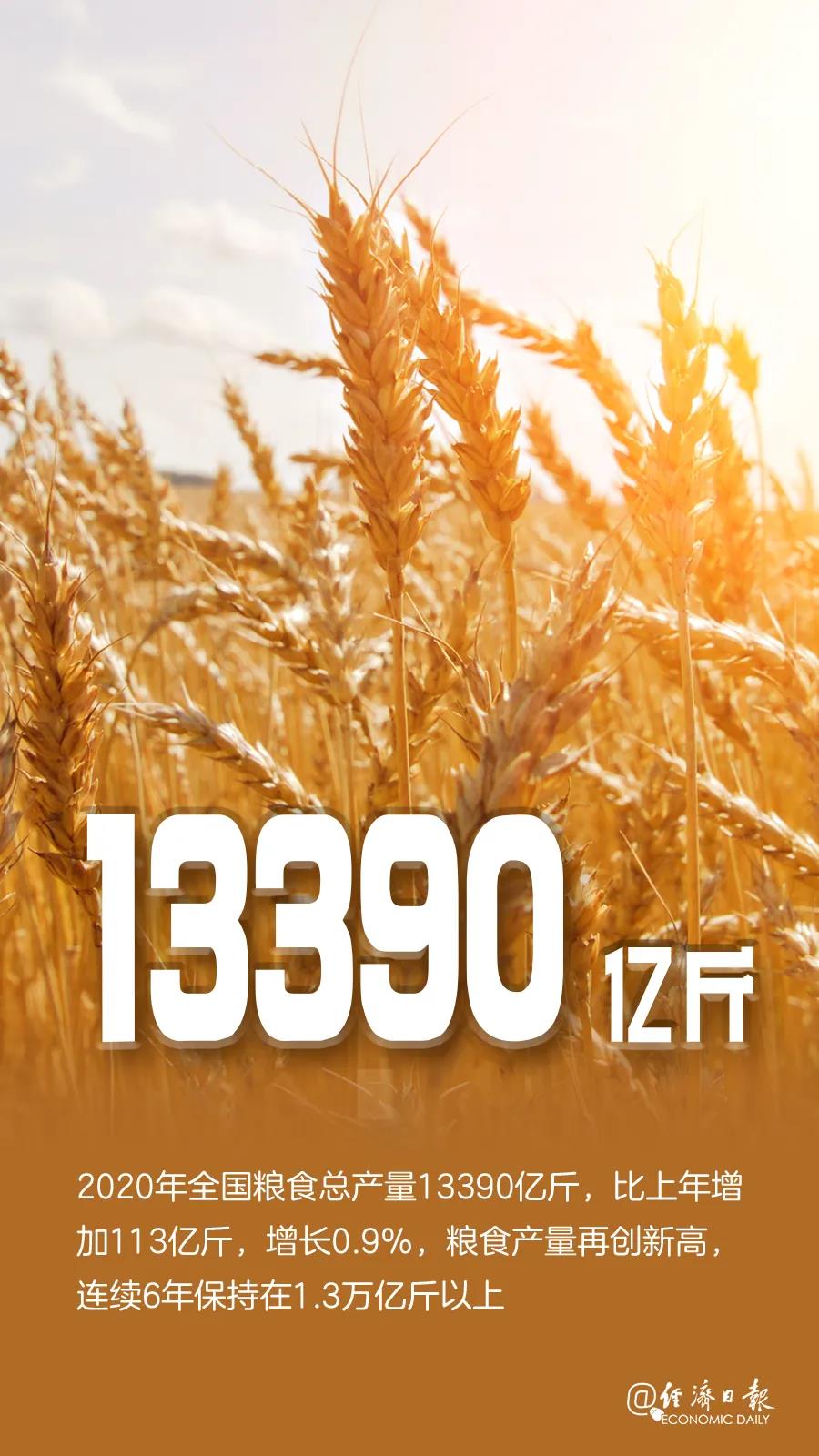 2020年,全国粮食总产量13390亿斤,比上年增加113亿斤,增长0.9%,粮食产量再创新高,连续6年保持在1.3万亿斤以上。全国粮食播种面积17.52亿亩,比上年增加1056万亩,增长0.6%。
