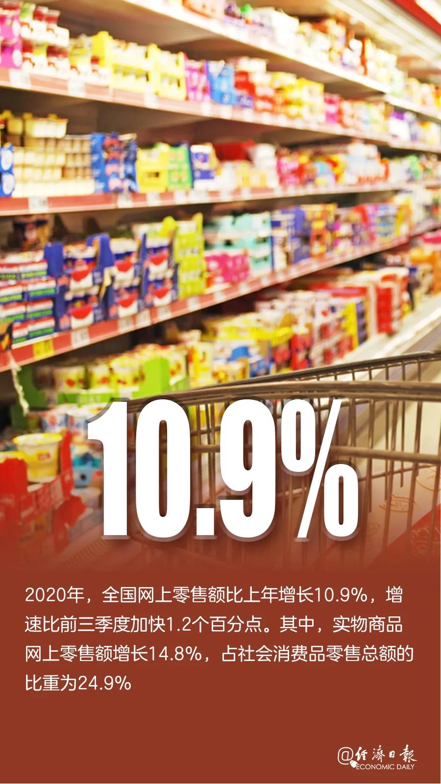 线上消费较快增长。受疫情影响,居家消费需求明显增长,“宅经济”带动新型消费模式加快发展。2020年,全国网上零售额比上年增长10.9%,增速比前三季度加快1.2个百分点。