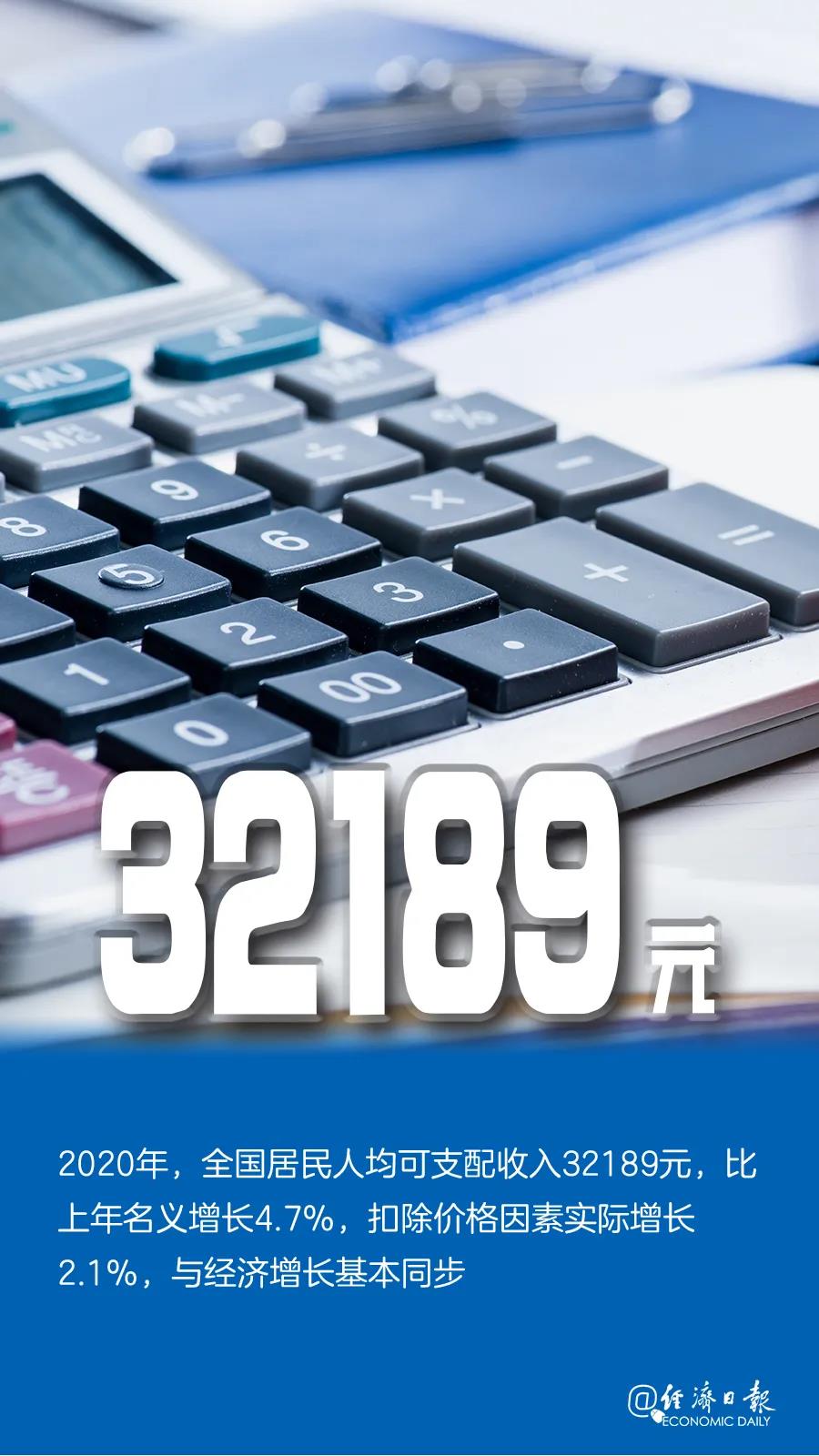 居民收入增长与经济增长基本同步。2020年,全国居民人均可支配收入32189元,比上年名义增长4.7%。扣除价格因素后,全国居民人均可支配收入实际增长2.1%,与经济增长基本同步。