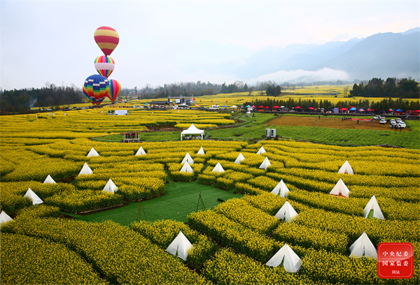 五月正是腾冲百花盛开、春光最好的时节。五一期间,游客赏美景、看鲜花、体验热气球,带着家人孩子来感受露营的生趣和快乐。图为腾冲市界头沙家坝油菜花海、万寿菊花海。(云南省腾冲市纪委监委供 刘正凡 摄)