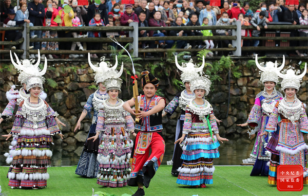 广西壮族自治区融水苗族自治县苗、瑶、侗、壮等少数民族依托丰富的旅游资源,在村屯、坡会等地开展吹芦笙、跳苗舞、踩堂、斗马、斗鸟等民俗活动,吸引众多游人前往观赏,促进农民增收致富,助力乡村振兴。图为该县梦呜苗寨进行的民俗表演吸引众多游人驻足观赏。(广西壮族自治区融水苗族自治县供 龙林智 摄)
