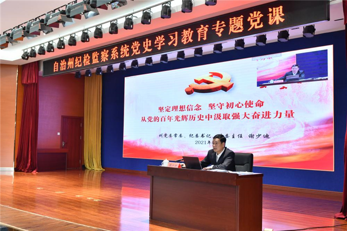 此次专题党课以“坚定理想信念 坚守初心使命 从党的百年光辉历史中汲取强大奋进力量”为主题,从铭记历史、展望未来和做好当下三个角度出发,重点围绕“开展党史学习教育的意义”“党的百年光辉历程”“党的百年征程中全面从严治党的历史脉络和推进自我革命的历史启示”“如何学好党史这门‘必修课’”四个方面开展。全州470余名纪检监察干部通过视频会议的形式,共同学习聆听。