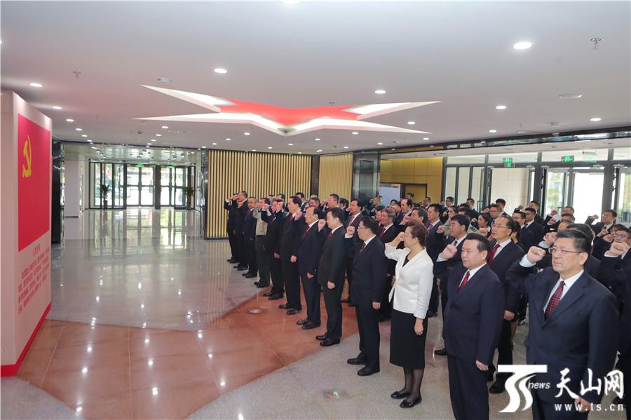 参观结束后,陈全国、雪克来提 · 扎克尔等来到纪念馆一楼大厅。面对鲜红的中国共产党党旗,陈全国庄重举起右拳,带领新党员入党宣誓,带领自治区领导同志重温入党誓词,铿锵有力的宣誓声响彻大厅。