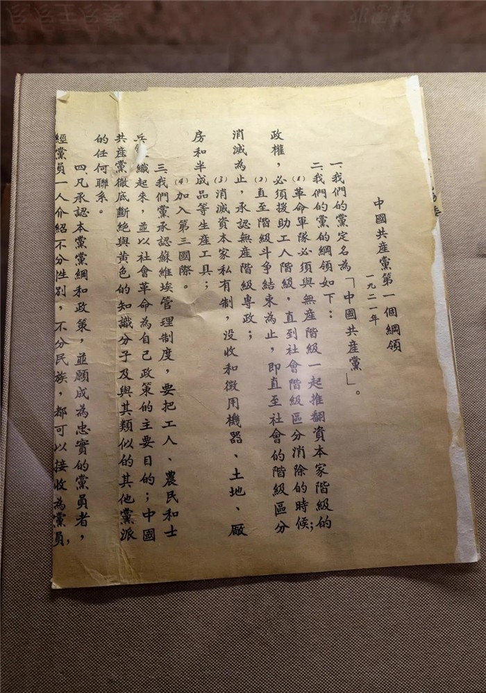 中国共产党第一次全国代表大会通过的《中国共产党第一个纲领》(复制品)。(图片来源:视觉中国)