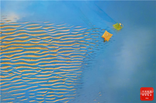 七月的滩涂色彩斑斓,沙滩在朝阳下闪耀着金色光芒,海水泛着蓝色微波,渔民带着各色渔具开始了一天的劳作。(福建省霞浦县纪委监委供 庄晓文 摄)