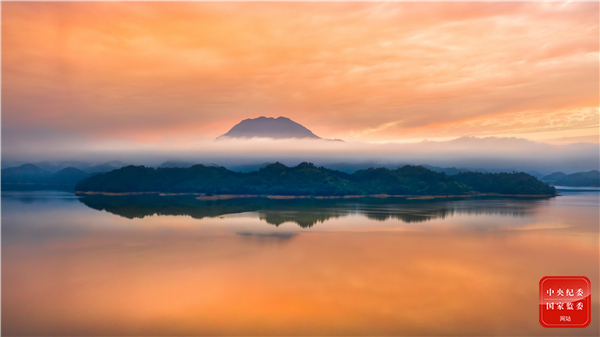 七月的朝霞绚烂迷人,伴着薄雾把天空和湖面染成一片橙红色,霞光中的群山缓缓苏醒,在云海中展露出苍翠而壮丽的身影。(杭州市纪委监委供 郑进奇 摄)