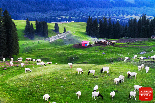 七月的草原生机勃勃,近处散落的羊群在惬意觅食,远处牧民指挥着牛群前行,在广袤的高山草甸中形成了一道独特的风景线。(新疆维吾尔自治区和静县纪委监委供 张建 摄)