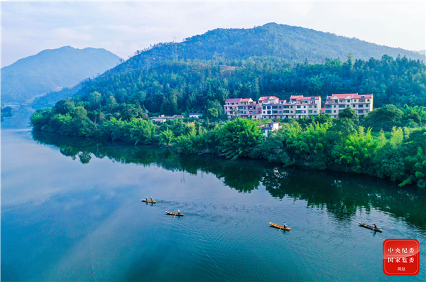 七月的水乡宁静祥和,渔民们泛舟而行在平滑如镜的湖面上划出道道涟漪,一幅绿水青山画卷徐徐展开。(江西省上犹县纪委监委供 杨文国 摄)