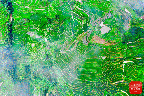 七月的梯田碧翠尽染,由于成熟度的细微差别而展现出深浅不一的“绿分五彩”色泽,期待秋天这里变成满地金黄的丰收景象。(云南省元阳县纪委监委供 张朝福 摄)