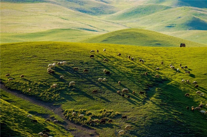察布查尔县乌孙山的绿茵深处是即将到来的初秋,在夕阳在余晖中美得不可方物。(伊犁州纪委监委 努尔曼拜·杰提米斯拜 摄)