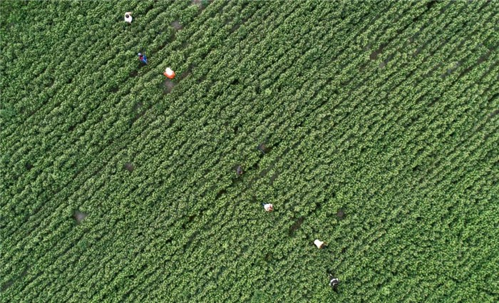 库车市塔里木乡,农民抓好农时,在自家棉田里打顶保铃,促进棉花增重增产,田间地头一派繁忙景象。(库车市纪委监委 袁欢欢 摄)