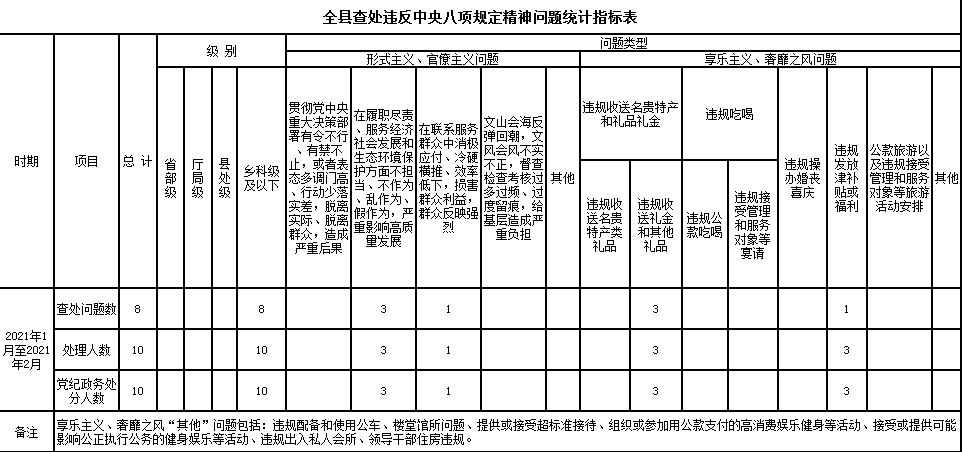 全县查处违反中央八项规定精神问题统计指标表(1—2月份)