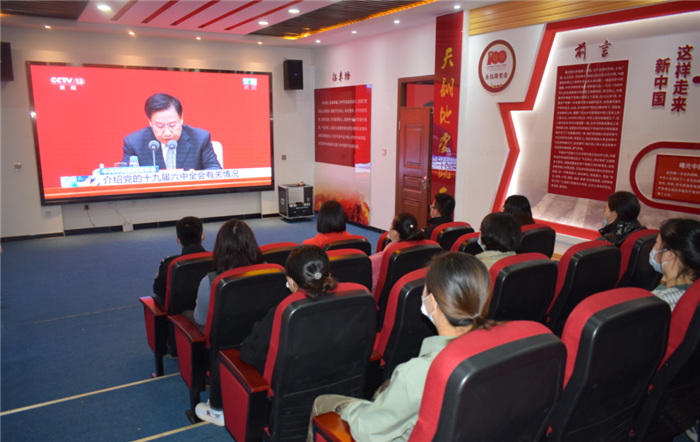 乌什县乌什镇纪委组织干部集中收看党的十九届六中全会精神新闻发布会。(李琦 摄)