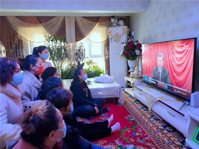 库尔勒市梨香街道纪检监察干部与结对亲戚共同观看党的十九届六中全会报道,热议近年来新疆发生的巨大变化。(刘奕彤 摄)