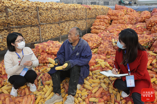 河南省杞县纪委监委紧盯耕地地力保护补贴、农机购置补贴、小麦玉米最低收购价等惠农政策落实情况,通过查看台账档案、现场实地走访等方式常态化开展监督检查,用监督保障扛牢粮食安全责任。图为11月4日,杞县纪委监委宣传部干部深入柿园乡万寨村,就玉米产业种植、生产、销售等情况采访农户。(河南省杞县纪委监委 李露露 摄)