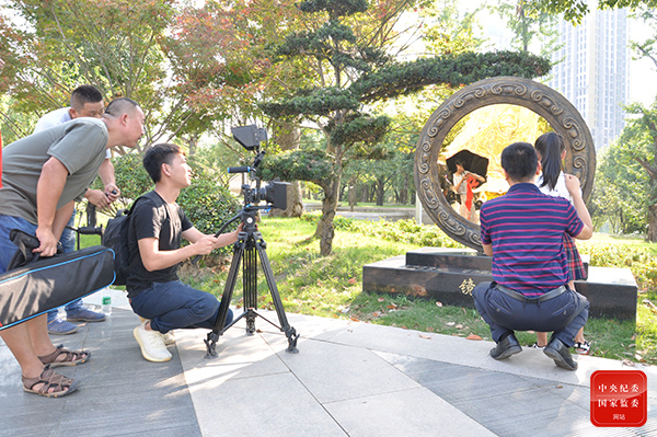 重庆市南川区纪委监委聚焦主业,创新方式方法,发挥纪检监察宣传工作的教育、警示、引导作用,讲好纪检监察精彩故事,传播正风反腐好声音。图为该区纪委监委在该区廉政文化公园拍摄警示教育片。(重庆市南川区纪委监委 王晓菲 摄)