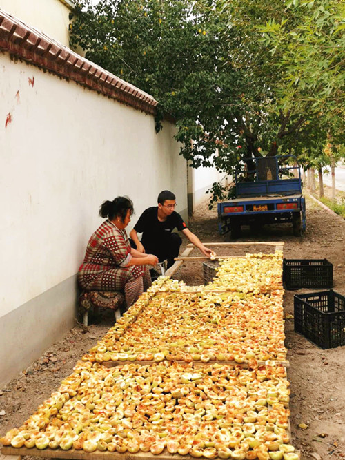 当村民玉素甫·玉山骑着电动三轮车回来时,看到院子里摆放着晾晒网,高兴地说道:“真的很感谢你们,有了晾晒网,把桃子晒成桃干,就不用担心桃子烂到地里了。”