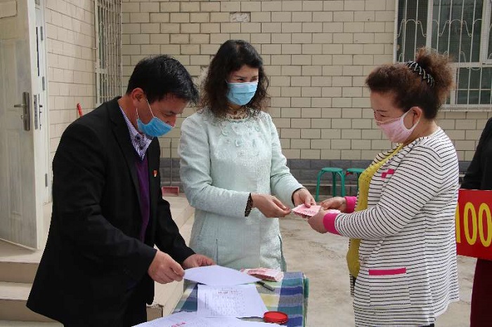 4月15日,尉犁县尉犁镇举办扶贫牲畜分红发放仪式,14户受益贫困群众喜领分红金。该镇纪委干部、扶贫办干部到场监督。