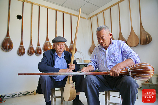 在新疆维吾尔自治区巴音郭楞蒙古自治州若羌县,非物质文化遗产传承人阿布来提·库尔班与巴拉提·巴克两位老人为更好地演绎《若羌赛乃姆》、传承民族文化,亲手制作乐器萨塔尔。(新疆维吾尔自治区巴音郭楞蒙古自治州若羌县纪委监委供 孙海娜 摄)