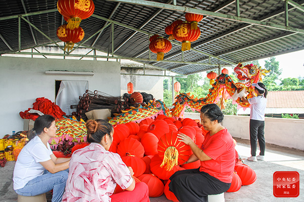 重庆市铜梁区最为鲜明的文化符号是“龙文化”,“靠得住、顶得起、过得硬、容得下”的铜梁脊梁精神,也融进了龙乡儿女的血液。图为铜梁区水口镇村民在龙灯彩扎基地工作。(重庆市铜梁区纪委监委供 孙正翠 摄)